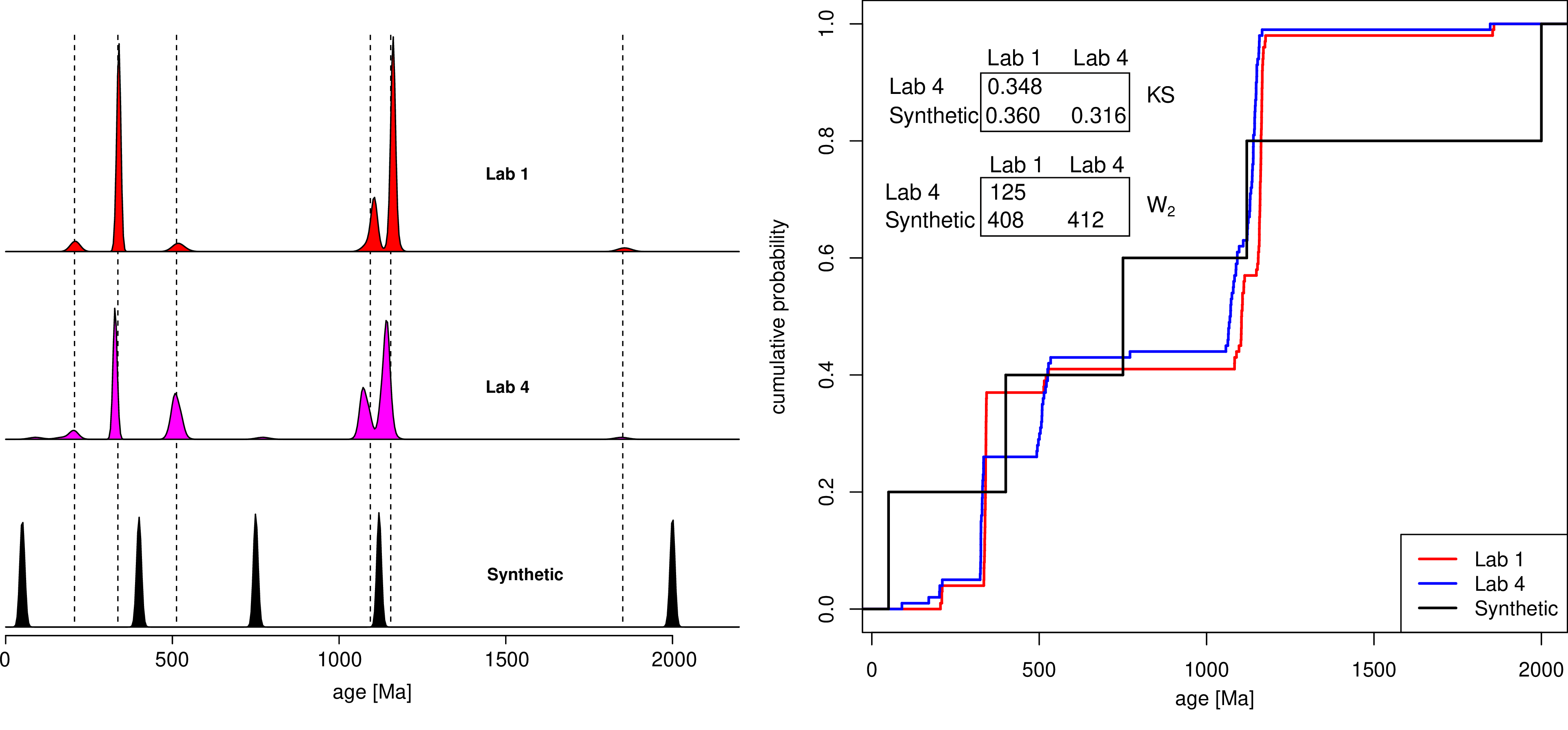 A final scenario where the W2 could be preferable is when comparing samples from different laboratories which are affected by inter-laboratory bias. Košler et al. (2013) provided ten different laboratories with identical synthetic zircon samples with a known age distribution. Different instruments introduced small differences in the ages of each peak. For example, in Figure 6 we display the results from Lab 1 (red) and Lab 4 (pink) as KDEs. The expected peak at ~ 1200 Ma (dashed line) is offset between the two samples. As it is the maximum distance between two ECDFs, the KS distance is very sensitive to minor offsets in sharply defined peaks. In this case, the KS distance between these theoretically identical samples is large at 0.348, which is over one third of the maximum possible distance between samples. Indeed, the KS distance considers a synthetic, purposefully misaligned series of peaks (black KDE) to be more similar to the Lab 4 results than the results from Lab 1. The W2 distance, does not suffer from this oversensitivity to minorly offset peaks and correctly identifies the samples from Lab 1 and Lab 4 as being much more similar than the random synthetic distribution.