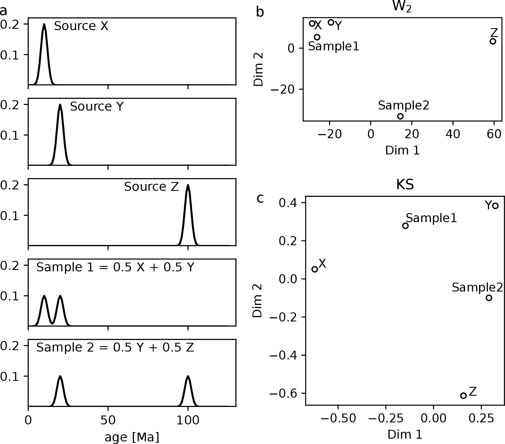 For example, let us consider three unimodal potential sediment sources, as shown in Figure 3a. We now consider two mixture samples. The first is an equal mixture of X and Y, and the second an equal mixture of Y and Z (bottom two plots, Figure 3a). Geologically, we would expect these samples to be about half as similar to the two source endmembers. However, a W2 MDS map identifies these samples as being removed from their two endmembers (Figure 3b). Additionally, because of the absolute time difference between Source Z and the other sources, Sample 2 is treated as a considerable outlier. The KS distance performs better here, placing the mixtures approximately halfway between the expected endmembers. However, in such a well defined mixing scenario as this, methods such as endmember mixture modelling may be more appropriate than statistical dimension reduction Weltje e.g., 1997; Sharman and Johnstone e.g., 2017; Dietze and Dietze e.g., 2019.