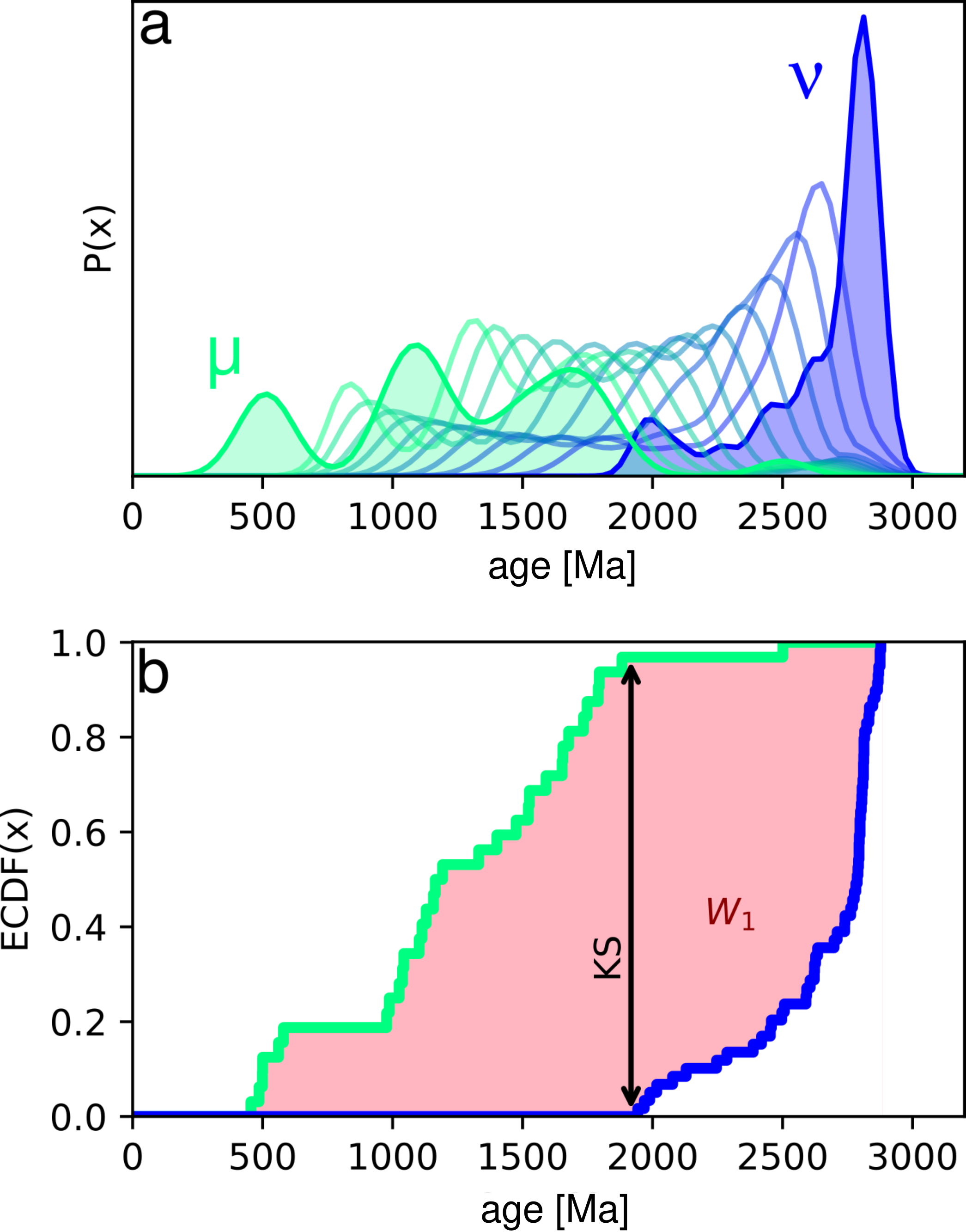 The Wasserstein distance is a distance metric between two probability measures from a branch of mathematics called ‘optimal transport’. Optimal transport is often intuited in terms of moving piles of sand from one location to another with no loss or gain of material (e.g., Villani, 2003). The problem that optimal transport solves is finding the way to transport the sand such that the least sand is moved the least distance. The Wasserstein distance is the cost associated with this most efficient transportation. The association with moving piles of sand is why the Wasserstein distance is often termed the Earth-mover’s distance. Figure 1a shows an example of how one univariate probability distribution, μ, based on a detrital age spectrum, is transformed into another, ν according to the optimal transport plan. Elsewhere in the Earth sciences, the Wasserstein distance is increasingly used for solving non-linear geophysical inverse problems (e.g., Engquist and Froese, 2014; Métivier et al., 2016; Sambridge et al., 2022) and has been proposed as a tool for fitting hydrographs (Magyar and Sambridge, 2023). Full mathematical treatments of the Wasserstein distance and optimal transport are beyond the scope of this paper, but interested readers are referred to Villani (2003) or Peyré and Cuturi (2019). A geophysical perspective is given in Sambridge et al. (2022).