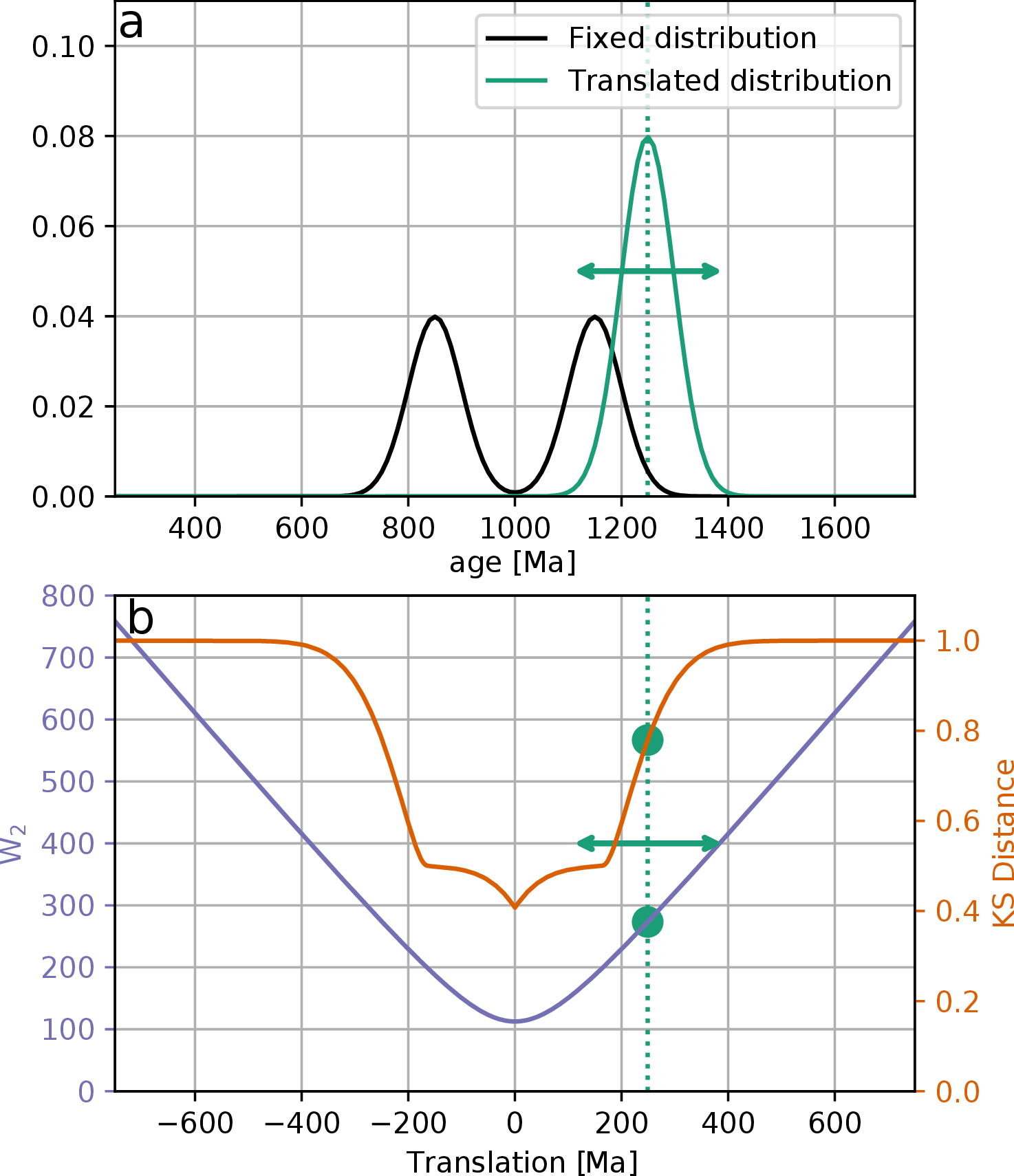 To demonstrate the intuition of W2 we explore a simple synthetic example. We consider two probability density functions of mineral ages: a bimodal distribution and a unimodal distribution, both constructed from Gaussians with the same scale (Figure 2a). We fix the bimodal distribution at 1000 Ma, but translate the unimodal distribution along the time axis. For each translated distribution we calculate both the KS-distance and W2. Figure 2b displays the behaviour of both distances under this scenario. The KS-distance shows an unexpectedly complex response containing a series of steps, as the peaks of the distributions align and misalign. At around ±400 Ma, once the distributions stop overlapping, the KS-distance plateaus at its maximum value of 1. By contrast, W2 increases monotonically with increasing distance. Away from the origin, W2 approximates a linear function of the amount of translation, as is predicted from Equation 3. At the origin, the non-zero value of W2 is the cost of turning the unimodal distribution into the bimodal distribution without translation.