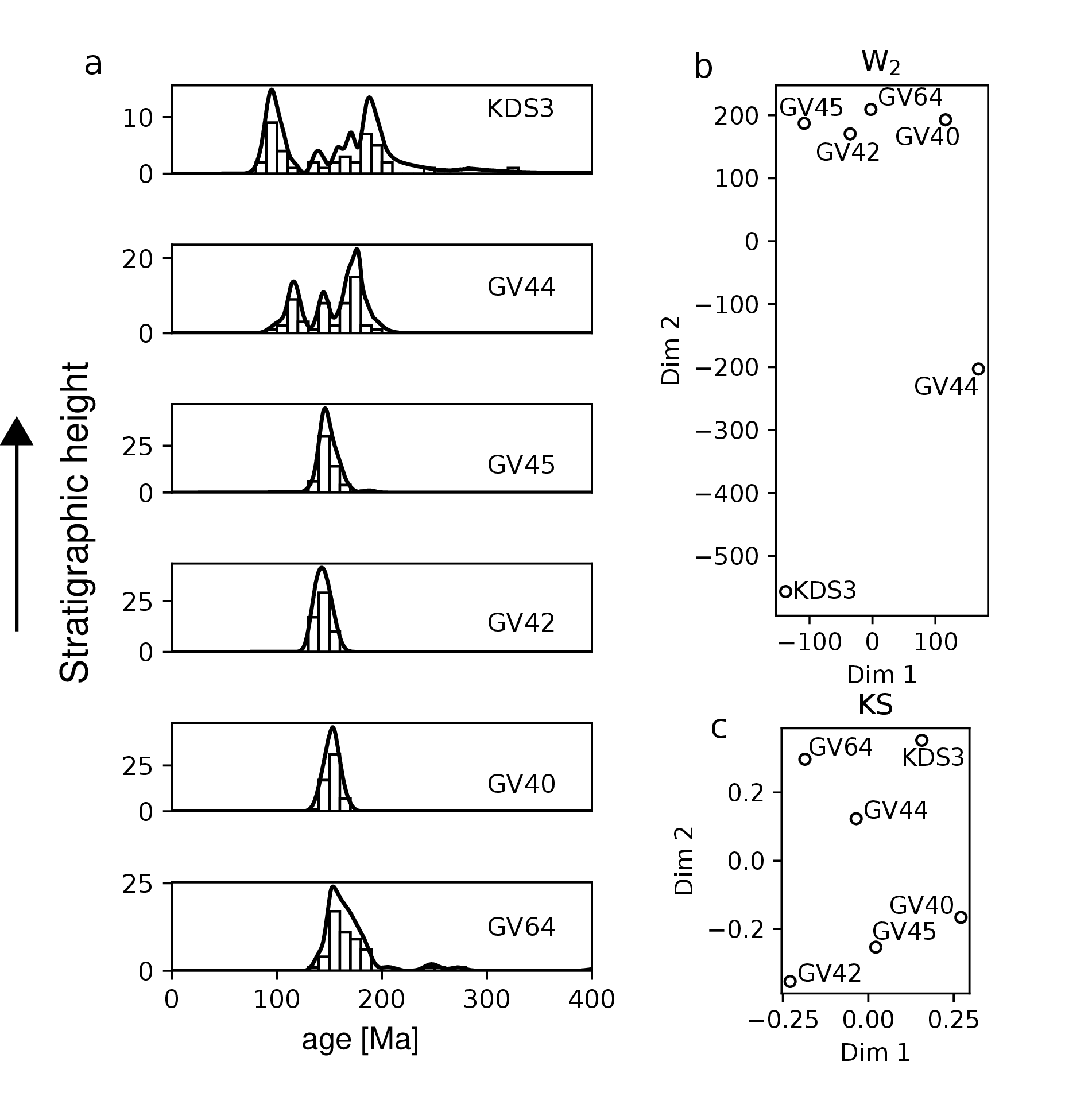 Figures 4b–c display MDS maps calculated using W2 and KS respectively. The W2 map clearly identifies the stratigraphic order of the samples by the changing distribution shape. Additionally, it clusters the four unimodal samples together. By contrast, the KS map does not identify the stratigraphic trend, locating the lowermost stratigraphic sample GV64 with the uppermost samples KDS3 and GV44. We conclude then that the W2 has better captured the geological information in this scenario.