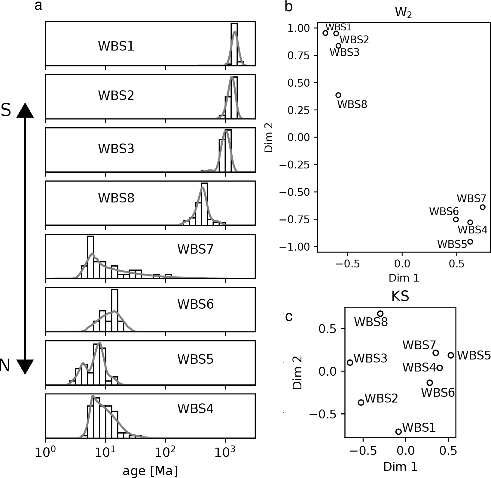 In thermochronology, age distributions shift along the time-axis according to thermal signals (e.g., exhumation). In many thermochronological studies, we may seek to characterise how such a signal evolves in space and time. For this question absolute distance along the time-axis is useful information and so the W2 may be more effective than the KS distance. For example, Wobus et al. (2003) use 40Ar/39Ar detrital mica thermochronometry to explore spatially varying exhumation along a spatial transect in the Himalaya. The KDEs of the samples are shown in Figure 5a arranged south to north. The southern samples (WBS1, WBS2, WBS3, WBS8) show old exhumation signals, but a dramatic shift to younger ages is observed north of a distinct physiographic transition. MDS maps of these samples are shown using the KS distance and W2 in Figures 5b–c respectively. As there is limited overlap between the samples, the KS distance struggles to capture the NS progression in exhumation age. Whilst the physiographic division is found, it weights it equally to variation within one cluster. By contrast, the W2 map correctly identifies the simple temporal and geographical trend of the samples from south to north.