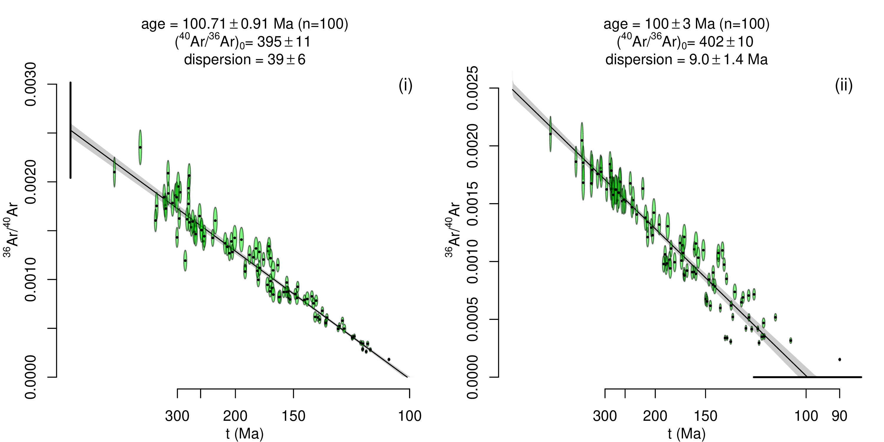 Figure 2 applies model 3 regression to two synthetic Ar–Ar datasets with a non-radiogenic 40Ar/36Ar-ratio of 400 and an age of 100 Ma. The dataset of Figure 2.i exhibits overdispersion of the y-intercept ([40Ar/36Ar]0 = 400,σa = 40), whereas the dataset of Figure 2.ii is overdispersed in the x-intercept (t = 100 Ma, σt = 10 Ma). In both cases, the maximum likelihood algorithm has retrieved the correct solution from the noisy data.