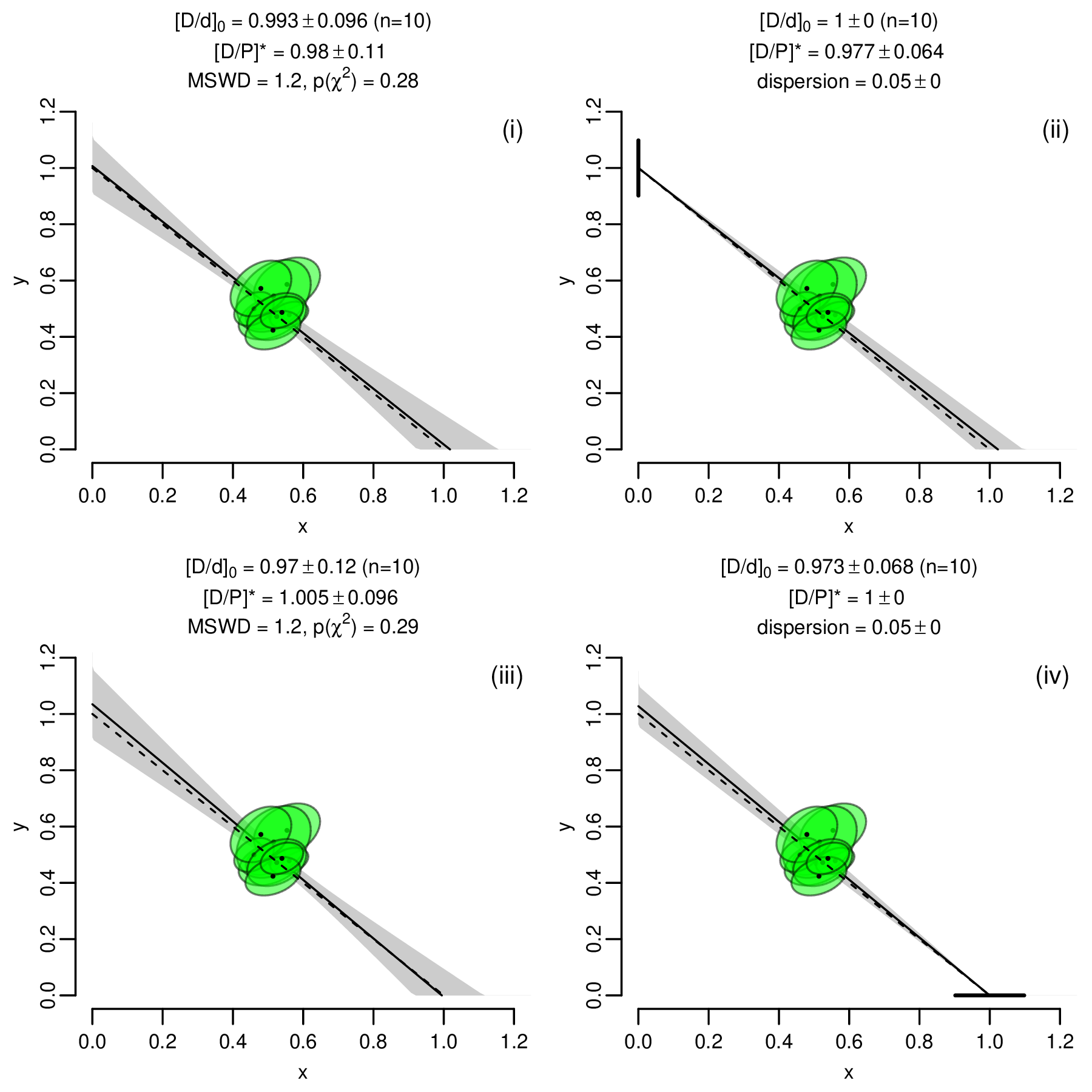 Note that this procedure fits the definition of a model 1 isochron, even though panels (ii) and (iv) of Figure 3 use the resulting data to illustrate model 3 regression. The synthetic data of Figures 2 and 4 are generated using a slightly different algorithm that simulates model 3a and 3b overdispersion. This modified procedure uses steps 1 and 3–5 of the procedure for Figure 1 whilst replacing step 2 with a random effects model, in which a and b are drawn from random normal distributions with standard deviations corresponding to the dispersion parameter σ (10% for Figure 2.i and 5% for Figure 4) and σ (10% for Figure 2.ii).