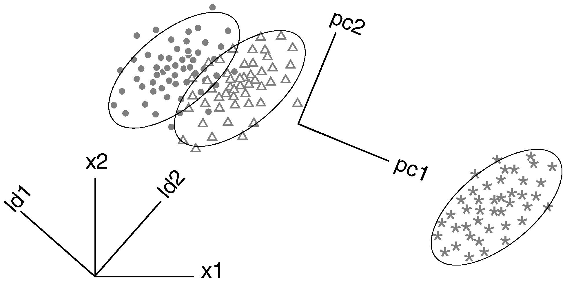 Figure 2: Similarities and differences between linear discriminant and principal component analysis. x1