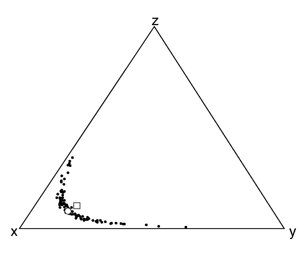 3%. Note that there are two different kinds of constant-sum constraint. The first is a physical one, resulting from the fact that all chemical concentrations add up to 100%. The second is a diagrammatic contraint caused by renormalizing three chosen elements to 100% on a ternary plot. Aitchison’s logratio-transform adequately deals with both types of constant sum constraint. The first type is discussed in Sections 5.1 and 5.3, the second in 5.2.