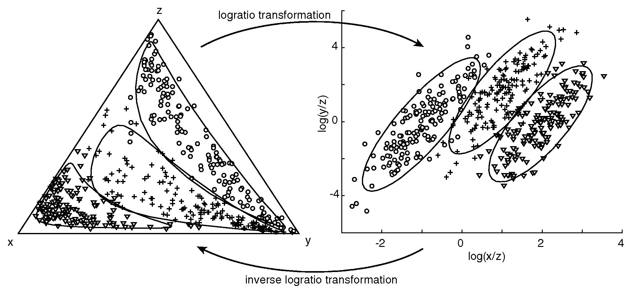 z. As a solution to this problem, Aitchison suggested to transform the data from ΔN-1 to ℝN-1 using the log-ratio transformation (Figure 6). After performing the desired (“traditional”) statistical analysis on the transformed data in ℝN-1, the results can then be transformed back to ΔN-1 using the inverse log-ratio transformation. For example, in the ternary system (X+Y+Z=1), we could use the transformed values V = log(X/Z) and W = log(Y/Z). Alternatively, we could also use V=log(X/Y) and W=log(Z/Y), or V=log(Y/X) and W=log(Z/X). The inverse log-ratio transformation is given by: