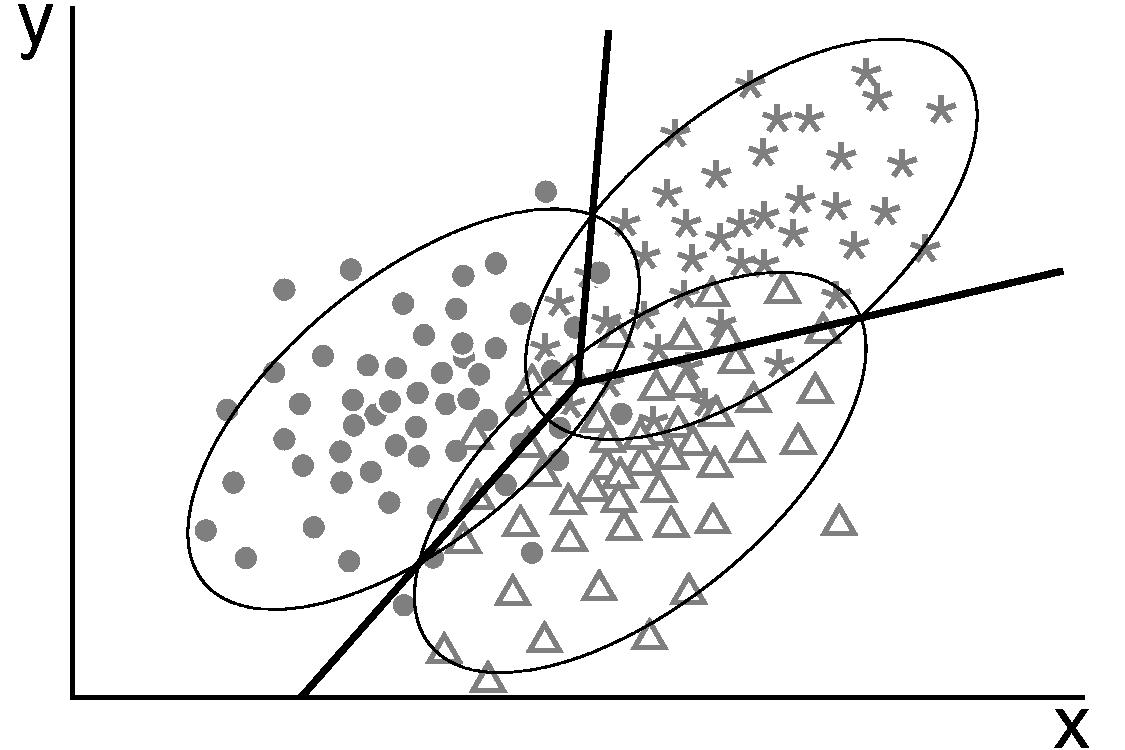 because Equation 5 is linear in x, the decision boundaries between the different classes are straight lines (Figure 8).