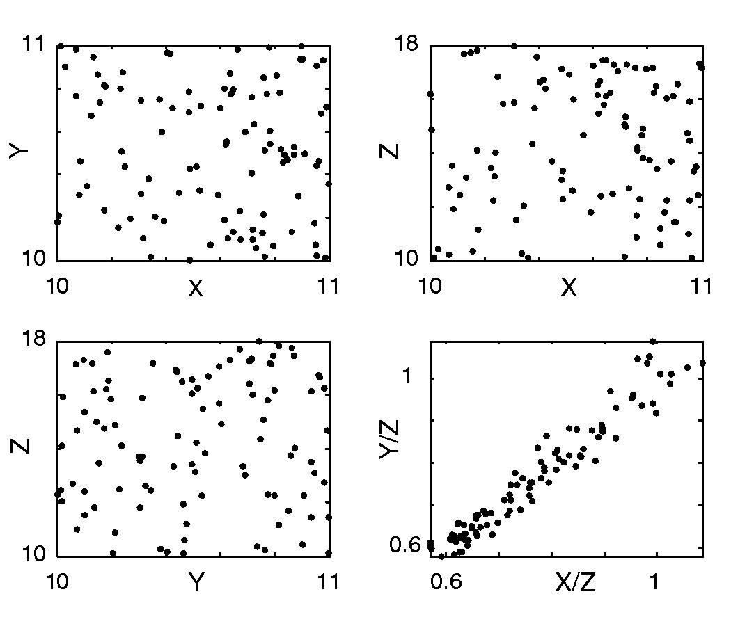 Figure 4: X, Y and Z are uncorrelated, uniform random numbers. The strong spurious correlation of the